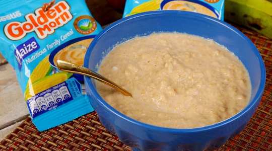 Golden Morn is a popular brand of instant cereal made from whole grains, primarily maize (corn) and soybeans. It is a product of Nestlé, a multinational food and beverage company. Golden Morn is commonly consumed as a breakfast cereal and is known for its high nutritional content, convenience, and ease of preparation.